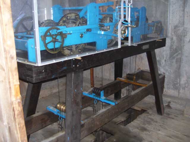 Ein Stockwerk höher trifft man auf die Glocken und noch eins höher auf das Uhrwerk, das einschließlich Getriebe zum Schutz vor Grabbelfingern in Plexiglas gehüllt wurde. |
