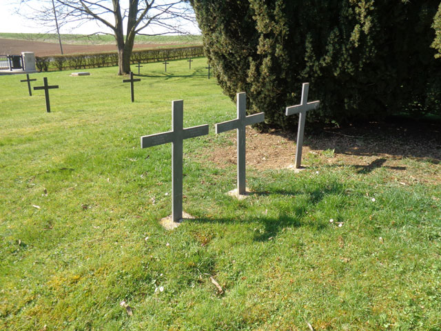 | Da, wo sich auf freiem Feld die von Vic-sur-Aisne kommende D145 und die nach Nampcel führende D335 treffen, kann man, wenn man nicht zu schnell vorbeidonnert, ein Areal ausmachen, das mit einer kleinen Hecke eingefasst und mit wenigen, aber sehr stattlichen Bäumen bestanden ist.