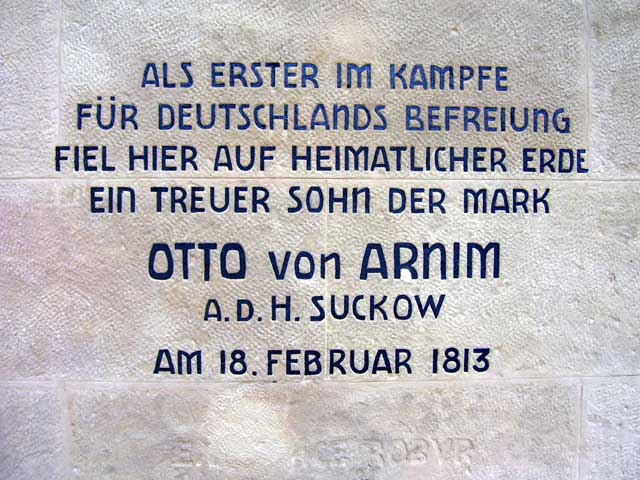| Vor 200 Jahre hat Preußen die erzwungene Allianz mit Frankreich aufgekündigt hat und es damit dessen Gegnern ermöglicht, die französischen Besatzer zu vertreiben. Napoleon, der schon vor Moskau stand, musste den Rückzug antreten und die nachfolgenden russischen Truppen haben sein Heer heimwärts getrieben. Die sogenannten Befreiungskriege, die in der Völkerschlacht von Leipzig ihren Höhepunkt fanden, hatten damit begonnen. Wir haben uns schon vor einiger Zeit ein Buch vorgenommen, das diese Ereignisse beleuchtet: Das 1863 erschienene Buch "Vor fünfzig Jahren" von Friedrich Adami. Darin wird im Kapitel Kosaken vor Berlin der verwegene Angriff einer kleinen russischen Reitergruppe auf das von Franzosen besetzte Berlin beschrieben. Dabei wird Otto von Arnim erwähnt, der in russischen Diensten stehend als vermutlich erster Preuße in diesem Krieg fällt - von einer französischen Kugel auf seinem Posten nahe Werneuchen getroffen. Einhundert Jahre später hat man ihm in Blumberger Lenné-Park, der zum Blumberger Schloss der Arnims gehörte, ein Denkmal gesetzt, das im letzten Krieg stark beschädigt wurde, aber vor gut zwei Jahren aufwändig restauriert und rechtzeitig zum 200. Jubiläum im September 2010 erneut der Öffentlichkeit übergeben wurde. | ![]() |