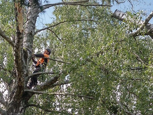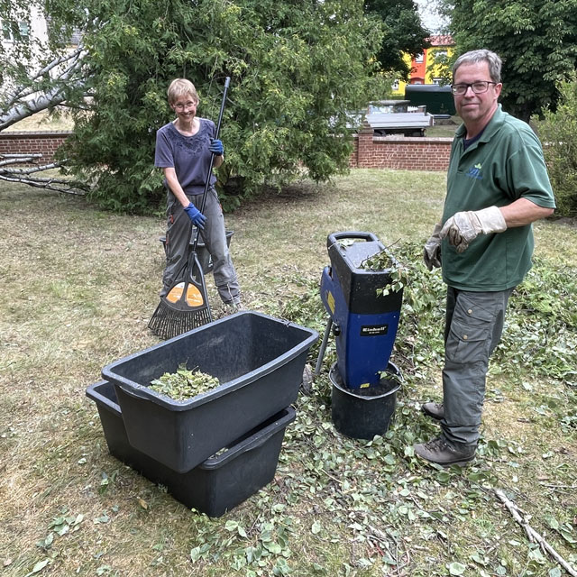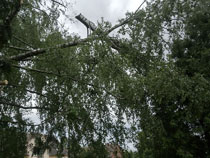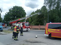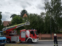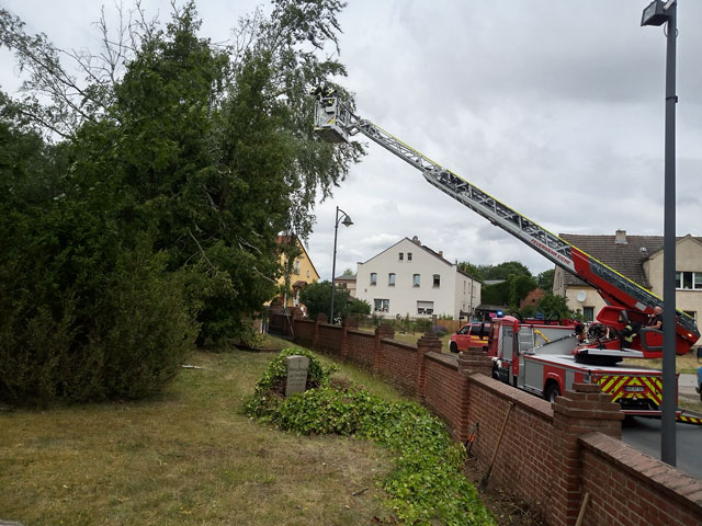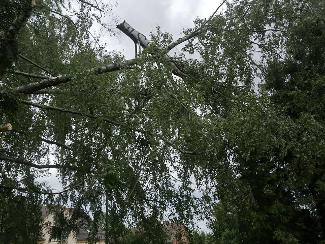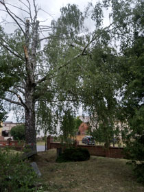 | Kaum war ein großes Stück des Friedhofs in einen ansehnlichen Zustand versetzt, da zog am Montag, den 23.6. ein Sturm über Brandenburg, der die alte, morsche Birke auf dem Friedhof an der Dorfkirche gekappt hat. Ein Teil der Krone hing in einem benachbarten Baum und drohte herunterzustürzen, weshalb Anwohner die Feuerwehr gerufen haben. |