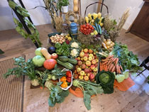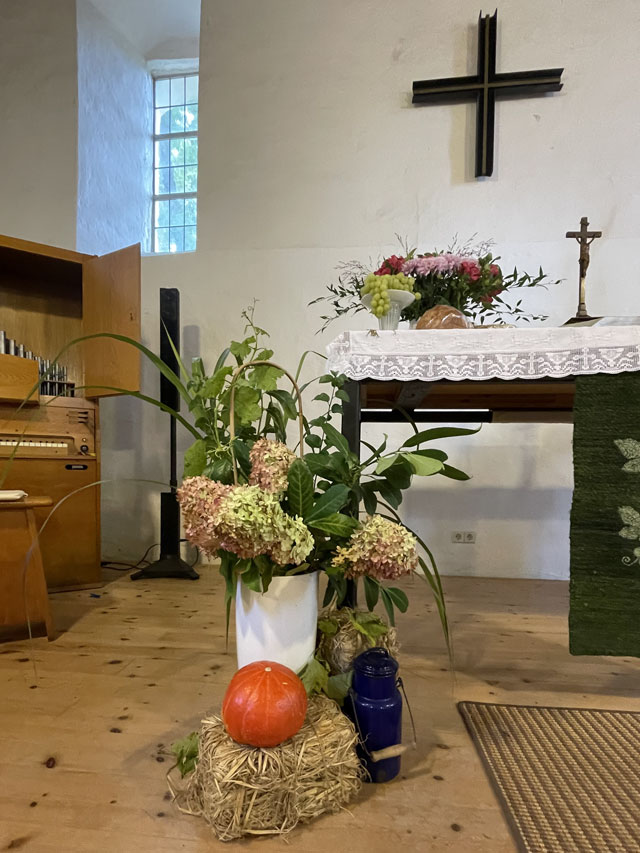 | Helma Thiele und Hanne Gladow haben den Altarraum sehr schön und einfallsreich mit den Erntegaben geschmückt, die am Tag zuvor gesammelt und zum Teil von ihnen selbst spendiert wurden. Ein ganz herzliches Dankeschön für dieses Engagement! Erfreulicherweise gab es auch Lebensmittelspenden von Bauer Matthes (Milchviehhof Blumberg GBR), von den Familien Deffke und Freudenberg sowie von Paul Plume (Ahrensfelde), der sich immer noch unserer Dorfkirche sehr verbunden fühlt. Die Lebensmittel gehen in diesem Jahr sämtlichst an die „Arche“ in Hellersdorf, ein Projekt, das Kinder aus sozial schwachen Familien unterstützt. So, wie wir uns über den Anblick freuen konnten, haben sich hoffentlich auch die „Arche-Kinder“ über das frische Obst und Gemüse gefreut. |