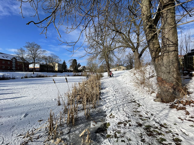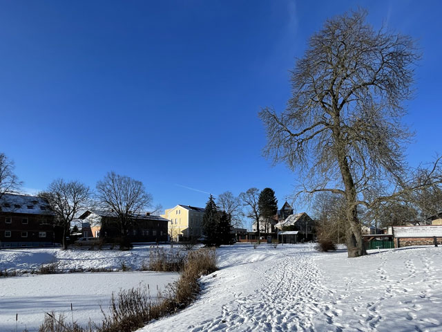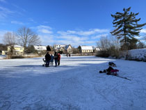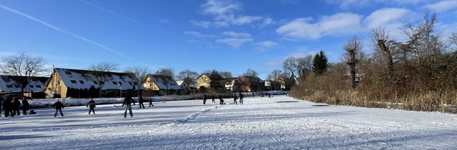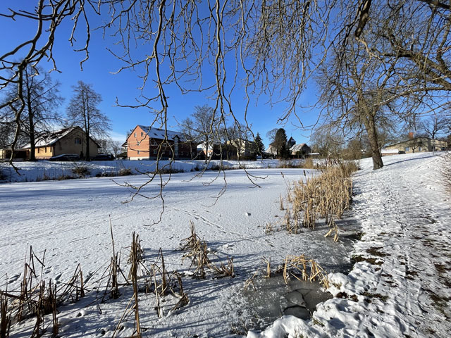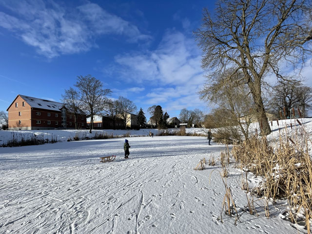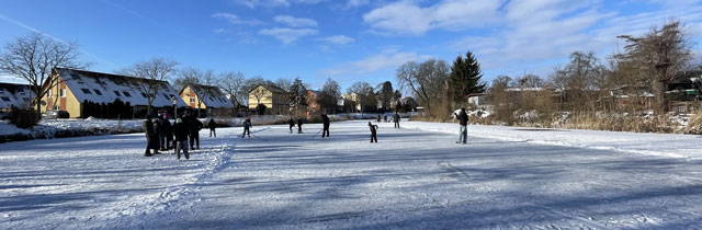 | Es ist schon wieder einige Jahre her, dass es kalt genug war, den Dorfteich zu betreten. Da ist es nur allzu verständlich, dass Jung und Alt am Ende der ersten Januarwoche auf den Dorfteich strömten, um dort Schlittschuh zu laufen, Eishockey zu spielen, von den Hängen zu rodeln oder einfach nur beisammen zu stehen und zu quatschen. |