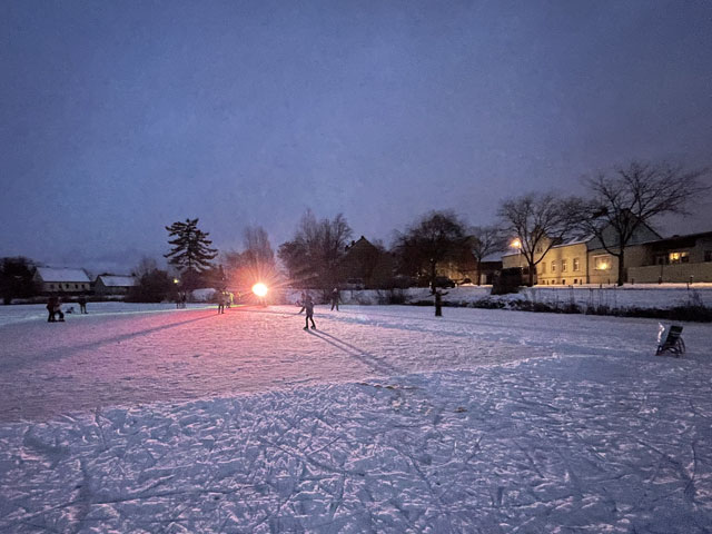 | Als dann am Samstagabend aus dem Nichts eine Musikbox und ein paar bunte Scheinwerfer auftauchten, war die Stimmung perfekt. Am Sonntag war dann fast schon Gedrängel auf der Eisfläche, denn auch einige Berliner hatten entdeckt, dass hier im Dorf was los ist. |