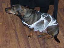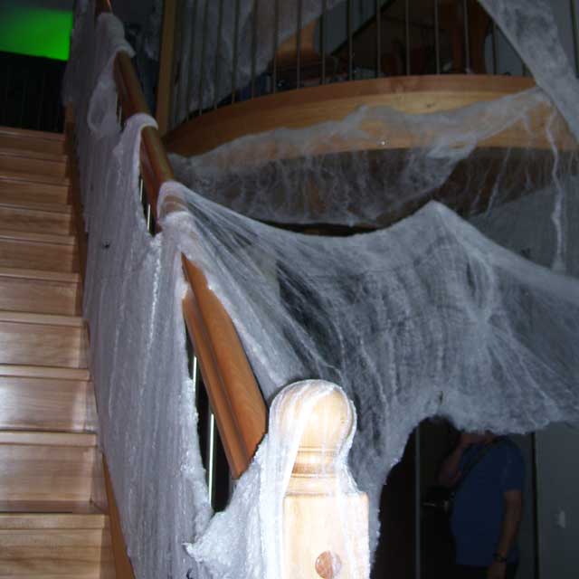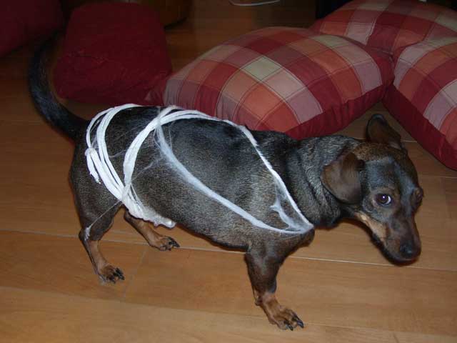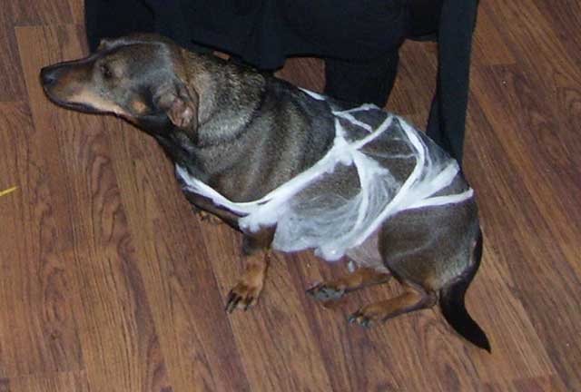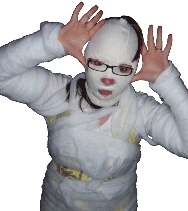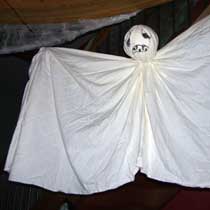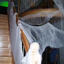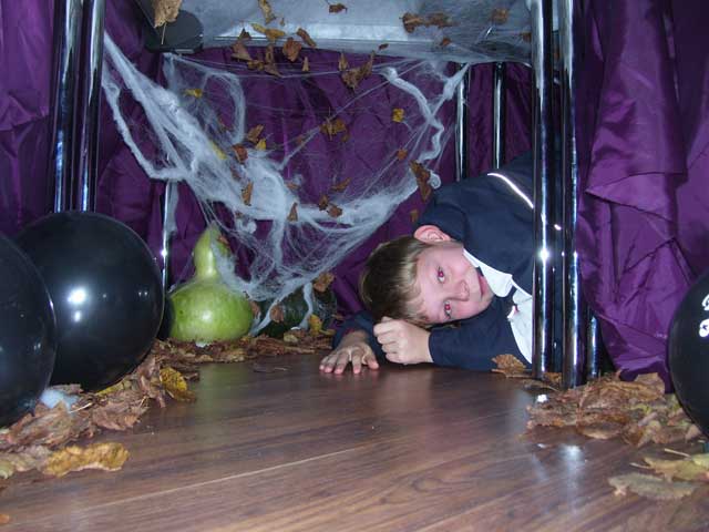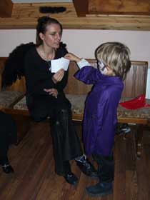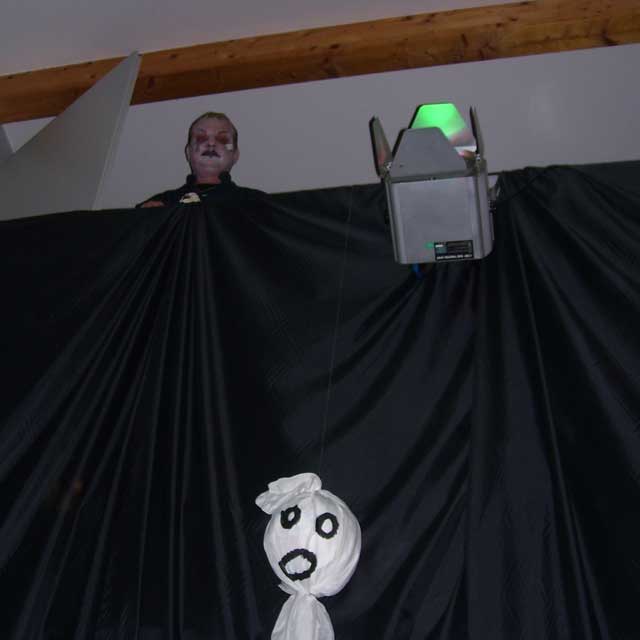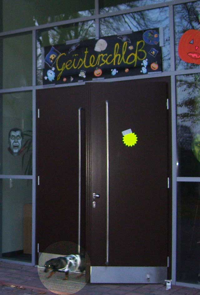 | Seit einigen Jahren ist es üblich, dass im Gemeindezentrum eine Halloween-Party für die Kinder steigt und dazu alles recht gruselig dekoriert wird. In diesem Jahr war sogar von draußen zu erkennen, dass im Gebäude Spuk und Gruselei angesagt ist. Die Fenster waren gegen neugierige Blicke abgedichtet und ins "Geisterschloss" kam nur, wer einigermaßen gespenstig aussah. Darüber hat unter anderem eine Hunde-Mumie gewacht, die auch das Umfeld inspizierte, aber nur selten einen Gruselgast gewürgt hat. |