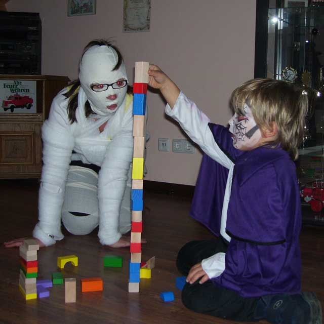 | Während Hexe Spinnebein und ein schwarzes Engelchen vergiftete Gummibärchen verlosten, hat eine Mumie, die als Pyramidenbewohnerin schon in früher Kindheit großartige Baumeister kennengelernt hat, sinnvollerweise die Endabnahme der beim Geschicklichkeitstest zu errichtenden Bauwerke übernommen. |