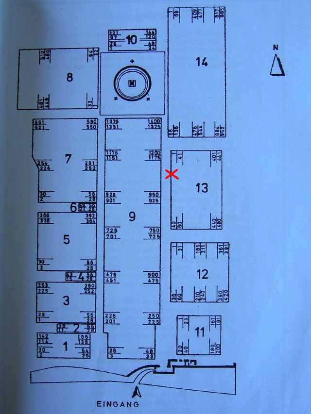 Willi Hange aus Ahrensfelde ist nach den Angaben des Volksbundes im Block 13 in der ersten Reihe bestattet - also direkt am Weg, der vom Eingang zur Gedenkstätte am gegenüber liegenden Ende des Friedhofs führt. Wir sind sicher auf dem Weg dorthin an dem Grab vorbei gelaufen.