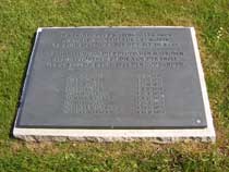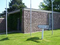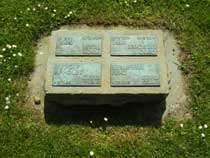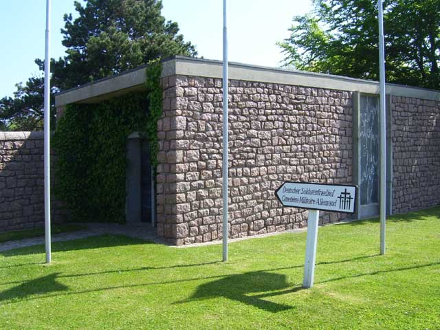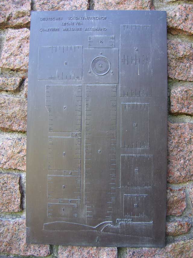 | Die Kreuze auf dem Wegweiser und auf der Bronze-Tafel am Eingang zeigen an, dass auch dieser Soldatenfriedhof vom Deutschen Volksbund für Kriegsgräberfürsorge betreut wird. | ![]() |
