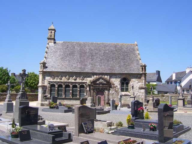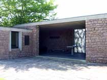| [Karte] Der Wegweiser führt im Südosten von Lesneven auf die „Route de Kerivoal“ und mitten in einem neuen Wohngebiet steht man plötzlich vor einem modernen Flachbau, der den Eingang zum Friedhof bildet und eine kleine Gedenkstätte enthält. | ![]() |