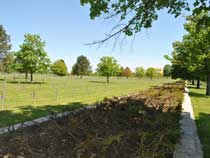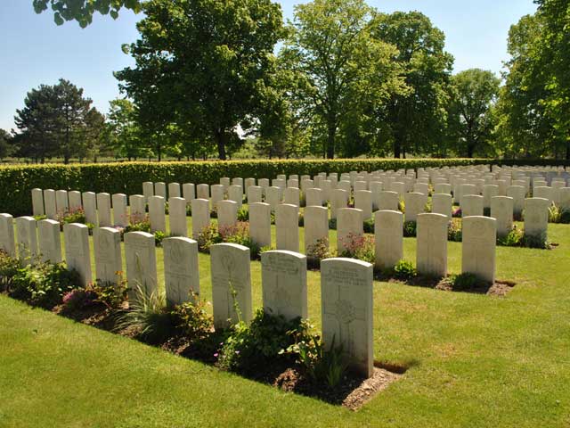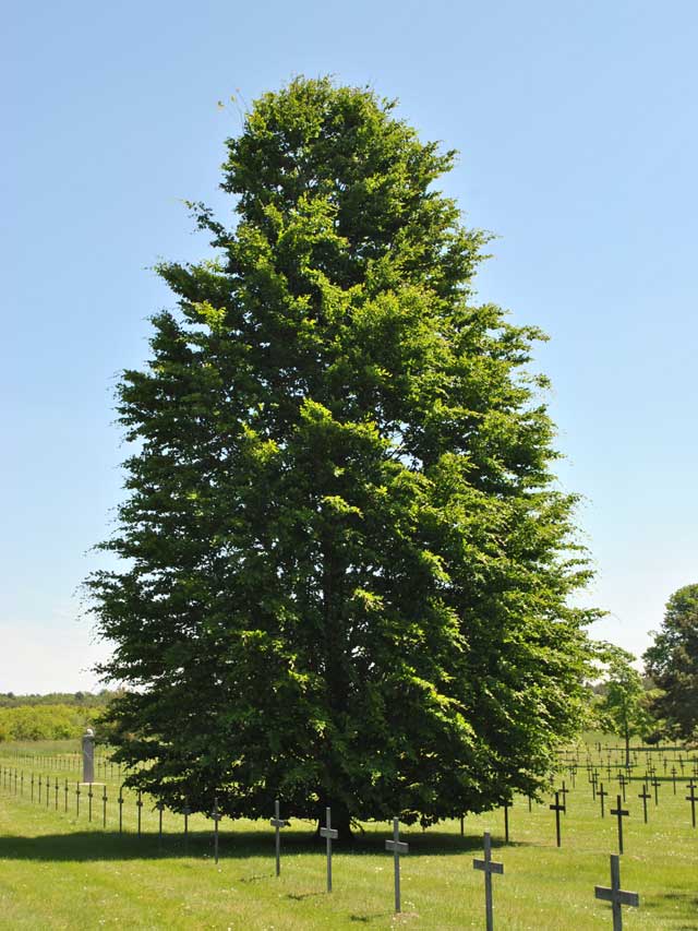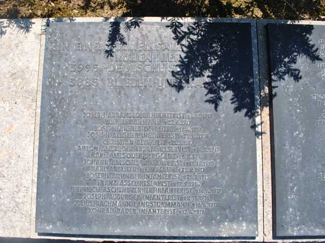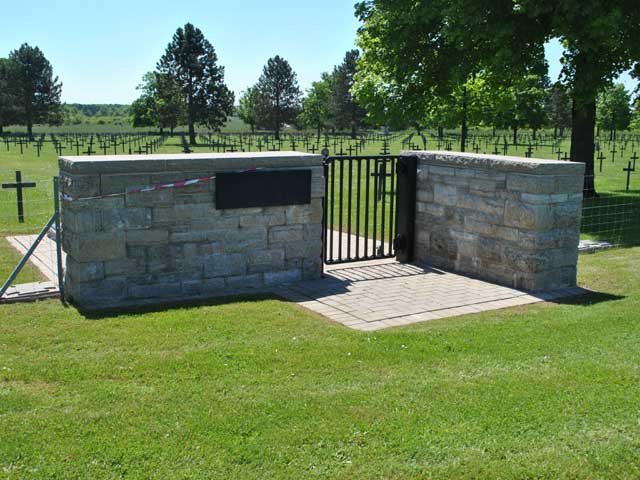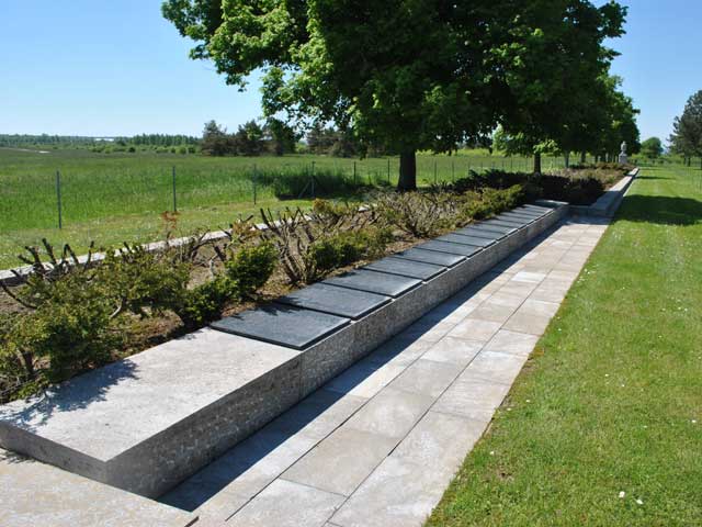 | Ein riesiges Hochbeet bildet die hintere Grenze des Friedhofs - ein Teil dieses Hochbeetes beherbergt ein Gemeinschaftsgrab für 3995 deutsche Soldaten, von denen 3885 unbekannt geblieben sind. Die wenigen, die identifiziert werden konnten, sind auf mehreren Bronzetafeln namentlich mit Dienstgrad und Sterbedatum aufgeführt. |