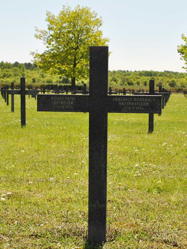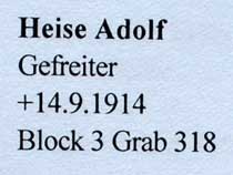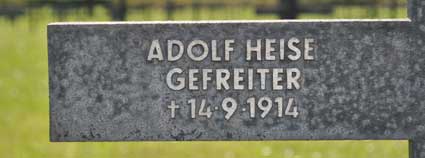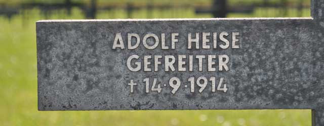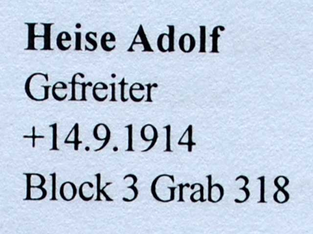 Am hinteren Rand des Friedhofs, nahe der einzeln stehenden Stele für den gefallenen „Leutnant der Reserve Otto Becker“ findet sich das gesuchte Kreuz mit der Aufschrift „Adolf Heise, Gefreiter, +14.9.1914“.