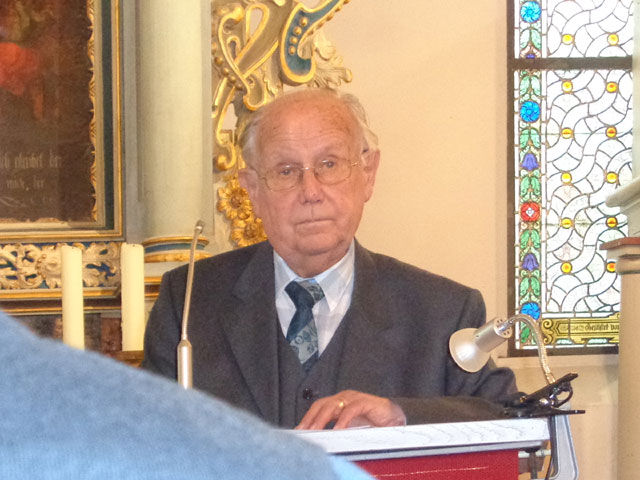 Joachim Klee vom Gemeindekirchenrat (rechts) setzte da nicht nach, sondern beschränkte sich darauf, den Gästen kurz die Kirche vorzustellen, in der sie sich befinden, und auf das Museum im Kirchenturm zu verweisen, das unter seinen Fittichen ist.