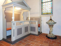 Pastorin Steffi Jawer (Mitte), die als „Hausherrin“ die Gäste in „ihrer“ Kirche begrüßte, wusste aber gleich zu kontern: Lila oder Violett ist durchaus eine typisch evangelische Farbe. Die Schilder mit dem Gottesdienstzeiten, die vielerorts an den Ortseinfahrten stehen, zeigen meist zwei oder neuerdings auch drei Kirchen, je eine lila, gelb und grün - und das Lila steht dabei für die evangelische Kirche ...