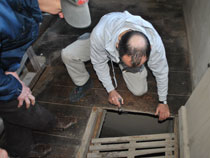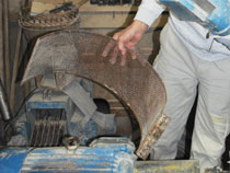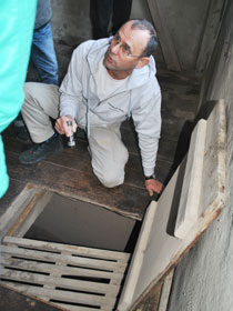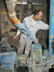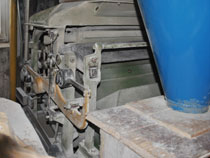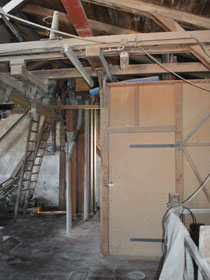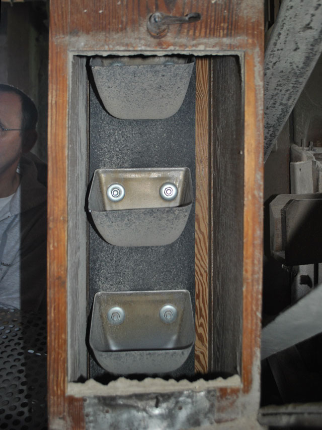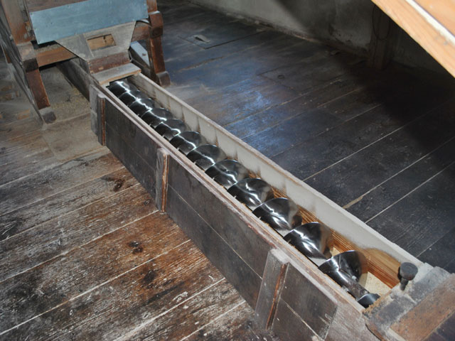 | Wo der Schneckenförderer das Getreide oder Mahlgut fallen lässt, bestimmen ein paar kleine unscheinbare Klappen, von denen einige den Weg in eines der großen Silos freigeben. | ![]() |