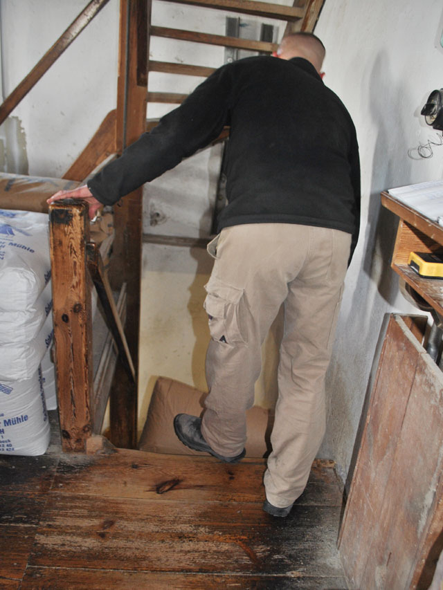 | Man kann die Treppe auch noch gut und gefahrlos zu Fuß bewältigen, wenn man nicht gerade beim Treppensteigen Selfies schießt - oder Lehrling ist. Zumindest meinen die zuständigen Behörden, dass Azubi's nur auf neuen Treppen schreiten können und haben der Mühle die Lehrlingsausbildung wegen der Gebrauchsspuren an der Treppe untersagt. |