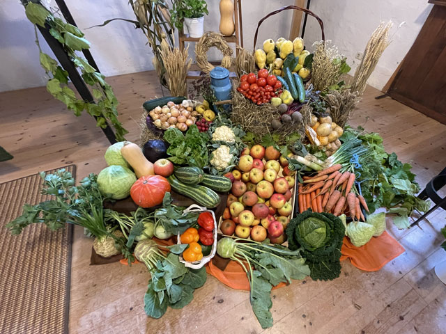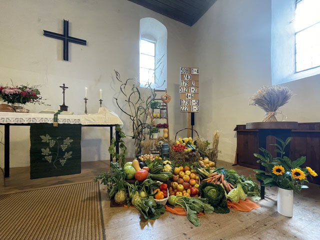 | Helma Thiele und Hanne Gladow haben den Altarraum sehr schön und einfallsreich mit den Erntegaben geschmückt, die am Tag zuvor gesammelt und zum Teil von ihnen selbst spendiert wurden. Ein ganz herzliches Dankeschön für dieses Engagement! Erfreulicherweise gab es auch Lebensmittelspenden von Bauer Matthes (Milchviehhof Blumberg GBR), von den Familien Deffke und Freudenberg sowie von Paul Plume (Ahrensfelde), der sich immer noch unserer Dorfkirche sehr verbunden fühlt. Die Lebensmittel gehen in diesem Jahr sämtlichst an die „Arche“ in Hellersdorf, ein Projekt, das Kinder aus sozial schwachen Familien unterstützt. So, wie wir uns über den Anblick freuen konnten, haben sich hoffentlich auch die „Arche-Kinder“ über das frische Obst und Gemüse gefreut. |