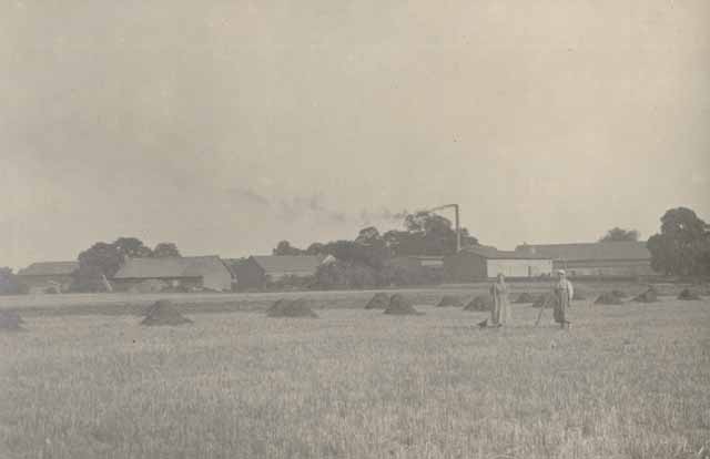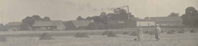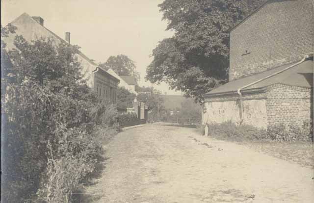 | Die Bilder stammen vermutlich aus den 1920er Jahren, denn wie das oben stehende Panorama (aufgenommen von einem Acker nördlich des Blumberger Weges) und das nebenstehende Bild (der Dorfeingang von Ahrensfelde kommend) zeigen, war die jetzige Mühle damals noch ein relativ flacher Bau. Zunächst diente er nur als Speicher für die nebenan stehende Brennerei (deren Schornstein im Panorama zu sehen ist) - die Aufstockung und der Umbau des Gebäudes zur Mühle erfolgte erst Ende der 20er Jahre. | ![]() |