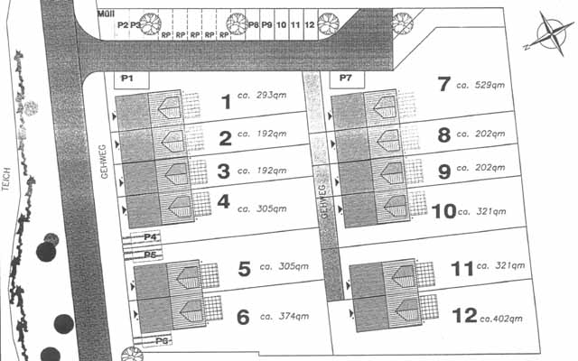 Als Mitte der 90er Jahre in einer Nacht-und-Nebel-Aktion Thürlings Hof verschwand (das Abrißverbot war wohl schon unterwegs, aber die Planierraupe war schneller), haben wir uns damit getröstet, daß ein Neubau an dieser Stelle dem Dorf vielleicht auch ganz gut tun würde. Gut fünf Jahre war die Fläche nun eine Brache, lange Zeit davon mit Bauschutt-Bergen und jeder Menge Müll - manches davon wurde weggefahren und über den Rest ist im wahrsten Sinne des Wortes Gras gewachsen. Und wir genügsamen Mehrower haben uns damit abgefunden, daß mitten im Dorf hinter einem häßlicher Bauzaun eine noch häßlichere Brache liegt. Na, wenn es die Einzige gewesen wäre, hätte sie vielleicht mehr Beachtung gefunden. Jetzt tut sich da endlich was. Eine Firma NCC aus Fürstenwalde plant, diese Fläche mit Doppel- und Reihenhäusern zu bebauen. In zwei Reihen sollen parallel zur Straße je ein 4er-Reihenhaus und ein Doppelhaus entstehen, insgesamt also 12 Wohneinheiten.