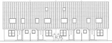 | Auf der Gartenseite haben die Häuser jeweils eine Terrasse mit zwei großen Glastüren, die Endhäuser besitzen zusätzlich noch eine Glastür im Giebel. Während zur Straße hin im Obergeschoß nur Dachflächenfenster sind, lockern auf der Gartenseite große Gauben die Dachfläche auf. Unter anderem in Fürstenwalde stehen schon solche Reihen- und Doppelhäuser, die hell gestrichen sehr freundlich aussehen. |
