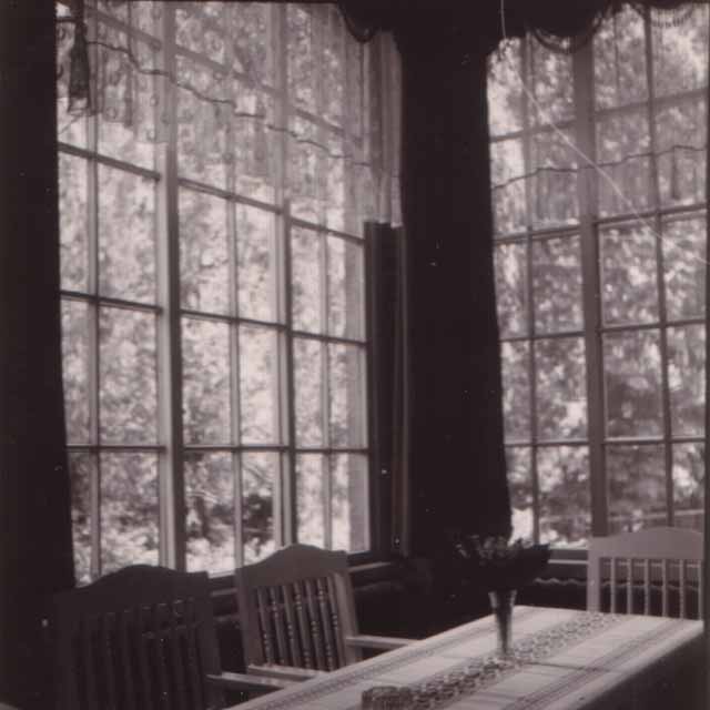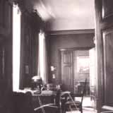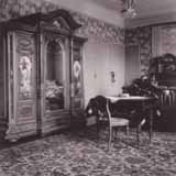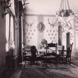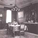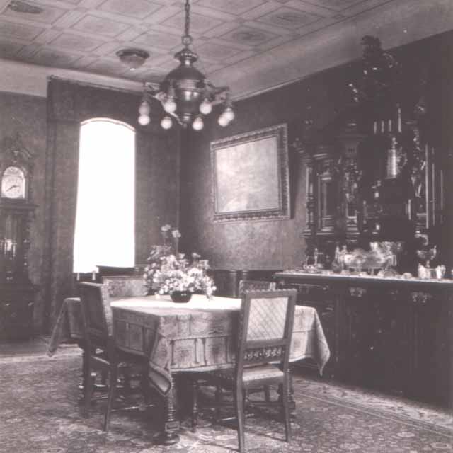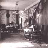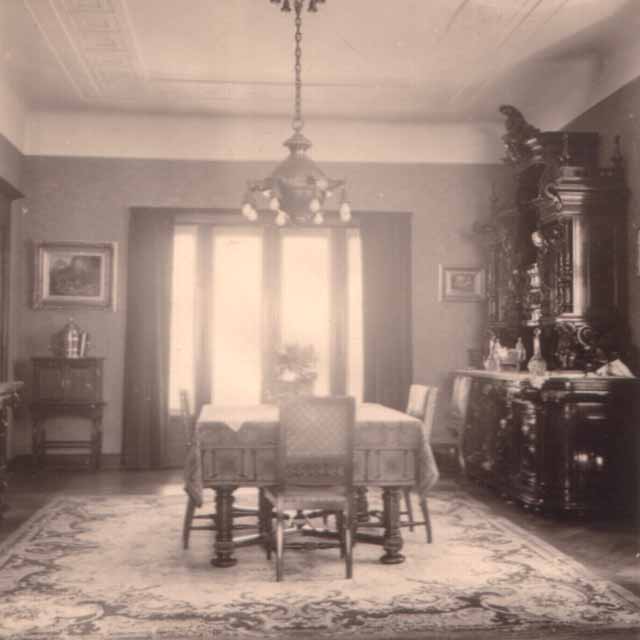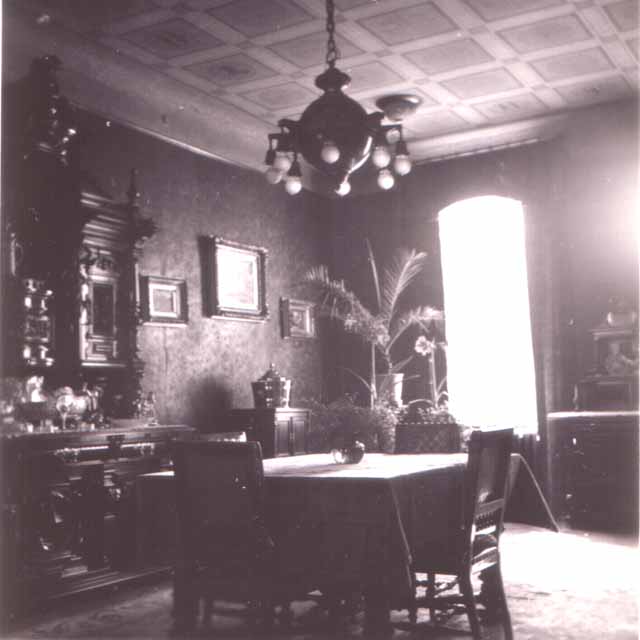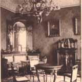 Die Eßzimmereinrichtung (Büffet, Eßtisch und Lampe) sind offenbar mal umgezogen. Auf dem linken Bilderpaar (mit bemalter Decke) befindet sie sich vermutlich im jetzigen Sitzungssal, aber wo die beiden Bilder oben aufgenommen wurden, ist noch rätselhaft.