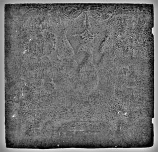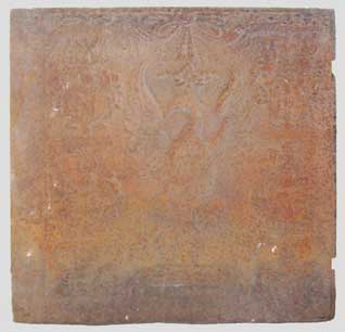 | Die im letzten Beitrag genannte Tafel aus Napoleonischer Zeit hat sich (vermutlich) inzwischen beim Aufräumen auf dem Gutsgelände angefunden: eine ca. 80*80 cm große Eisenplatte, die allerdings so stark verrostet ist, dass man (zumindest auf dem Foto) nicht viel darauf erkennen kann und man den Computer bemühen muss, um in der Schwarz/Weiss-Aufnahme wenigstens ein paar Details sichtbar zu machen. |