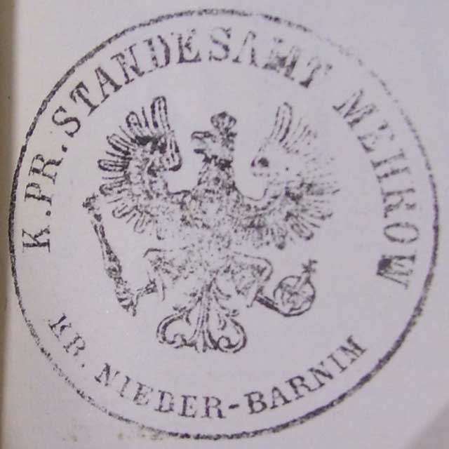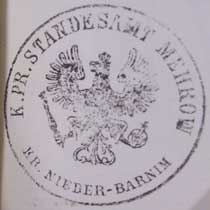 Im Jahre 1897 wird das Standesamt dann nach Ahrensfelde verlegt, behielt aber unverändert seinen Namen "Königlich Preußisches Standesamt zu Mehrow" bei, woran sich bis zum 2. Weltkrieg nichts geändert hat, außer dass 1918 das "Königlich" wegfiel.. |
