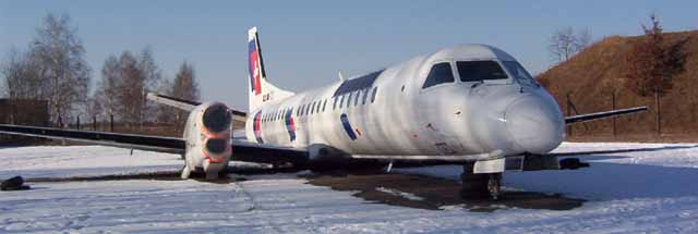 | Na, und gelegentlich verirrt sich ja auch mal ein Flieger ins nahe gelegenen Werneuchen, wie die Crossair-Saab, die im Juli 2002 bei Sturm dort notlandete und dann überwintern mußte, weil offenbar keiner das nur leicht beschädigte Flugzeug haben wollte. | ![]()  |