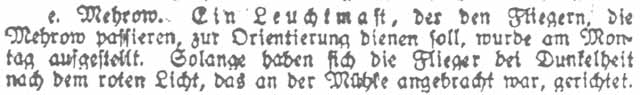 | Mehrow. Ein Leuchtmast, der den Fliegern, die Mehrow passieren, zur Orientierung dienen soll, wurde am Montag aufgestellt. Solange haben sich die Flieger bei Dunkelheit nach dem roten Licht, das an der Mühle angebracht war, gerichtet. |