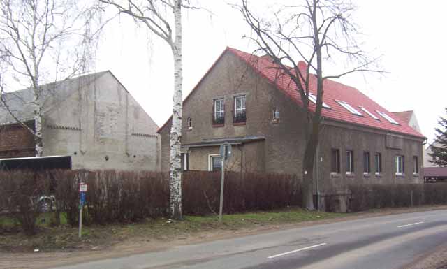 | Natürlich haben wir uns an der beschriebenen Stelle sofort auf die Suche gemacht, aber an der beschriebenen Stelle - zwischen Dorfstr. 1 (ehemalige LPG-Baracke und jetzt Sitz der Firma Rahlf) und der Dorfstr. 2 (ehemals Meißners Hof), also links auf dem nebenstehenden Bild, war nichts mehr zu finden, was nach dem Fundament eines solches Mastes aussieht. |