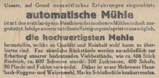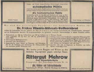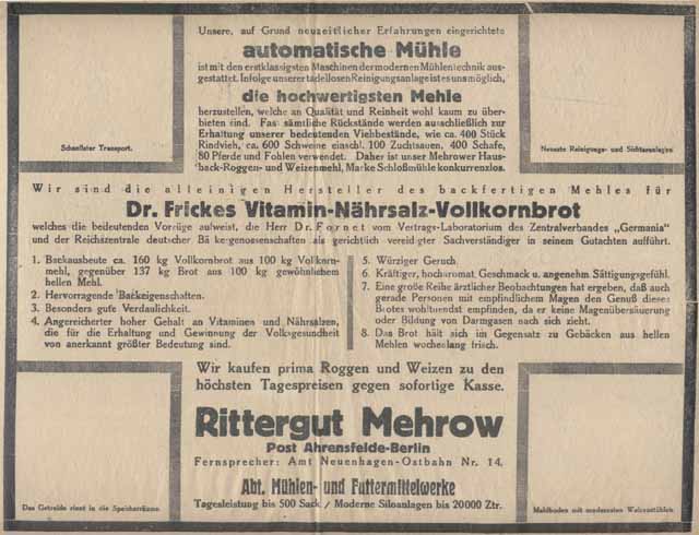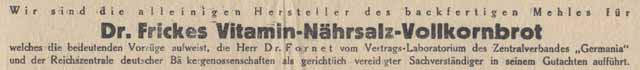 Wir sind die alleinigen Hersteller des backfertigen Mehles für Dr. Frickes Vitamin-Nährsalz-Vollkornbrot welches die bedeutenden Vorteile aufweist, die Herr Dr. Fornet vom Vertrags-Laboratorium des Zentralverbandes "Germania" und der Reichszentrale deutscher Bäckergenossenschaften als gerichtlich vereidigter Sachverständiger in seinem Gutachten aufführt. |