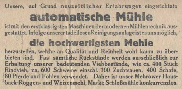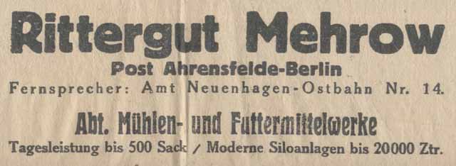 Rittergut Mehrow Post Ahrensfelde-Berlin Fernsprecher Amt Neuenhagen-Ostbahn Nr. 14, Abt. Mühlen- und Futtermittelwerke Tagesleistung bis 500 Sack / Moderne Siloanlagen bis 20000 Ztr. |