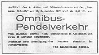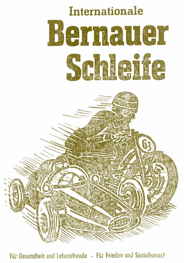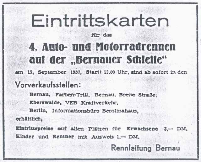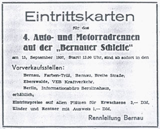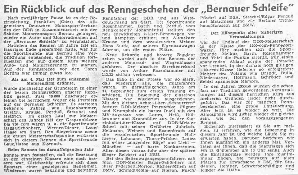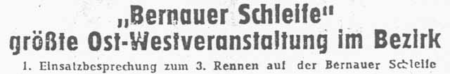 wurde gleichzeitig der Grundstein zu einer der besten Rennstrecken unserer Republik gelegt. Fast 70000 Zuschauer erlebten bei herrlichem Wetter die Premiere auf der "Bernauer Schleife". Es starteten bekannte Fahrer wie Rosenhammer, Greifzu, Krause, Perduß, Straubel und Helfrich. ...