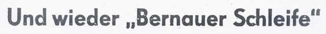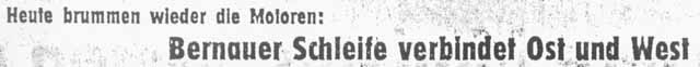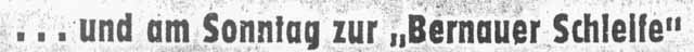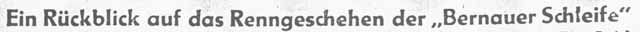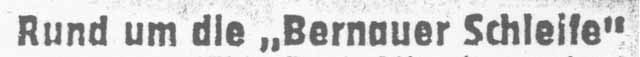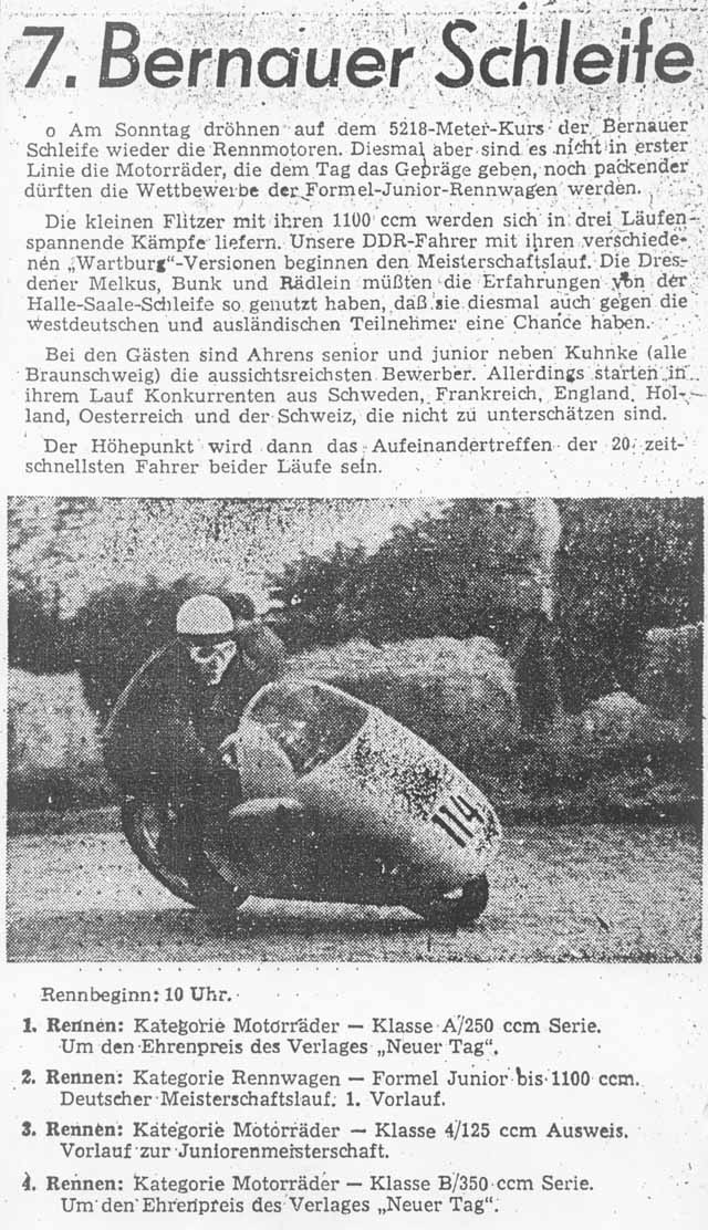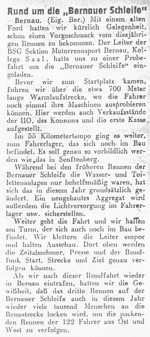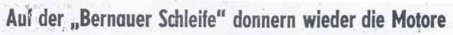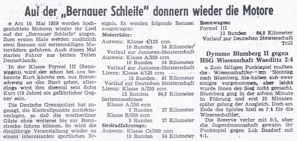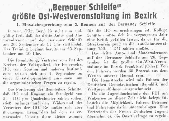 Am 10. Mai werden hochgezüchtete Motoren wieder ihr Lied auf der "Bernauer Schleife" singen. Zum ersten Mal werden zusätzlich zwei Rennen mit serienmäßigen Motorrädern gefahren. Auch dieses Mal starten Fahrer aus beiden Teilen Deutschlands. In der Klasse Formel III (Rennwagen) wird der schon bei uns bekannte Kurt Ahrens sen. aus Braunschweig an den Start gehen, allerdings wird ihm diesmal sein Sohn Kurt (19 Jahre) ein gefährlicher Gegner sein. Die Deutsche Grenzpolizei hat zugesagt, die Kontrollpunkte zurückzuverlegen, so daß die westberliner Gäste ohne weiteres bis zur Rennstrecke fahren können. So wird die diesjährige Veranstaltung wieder zu einem interessanten sportlichen Ereignis ... |