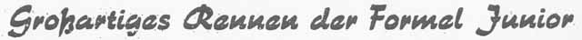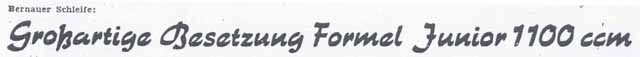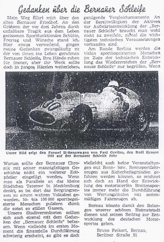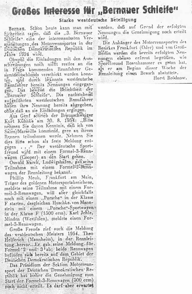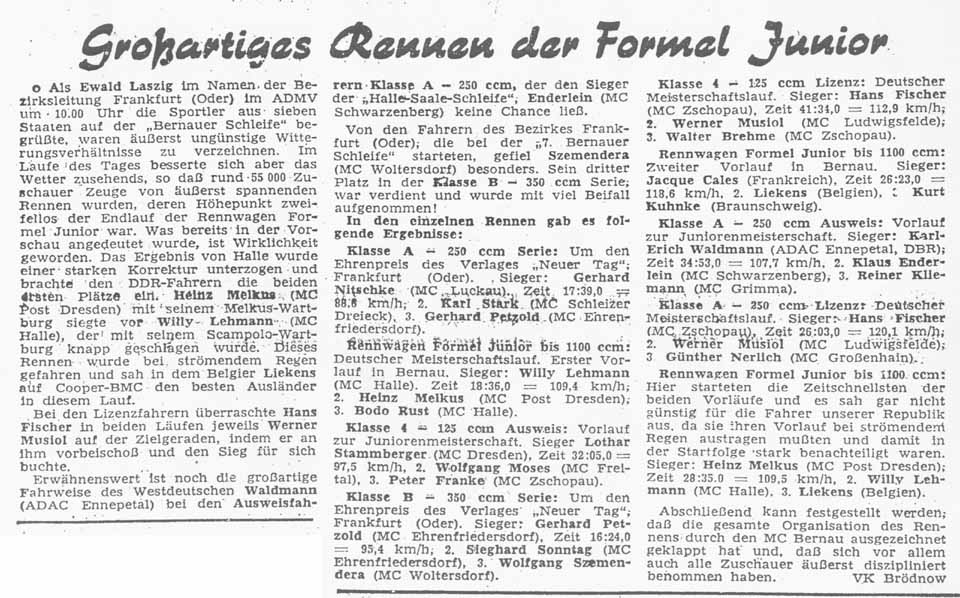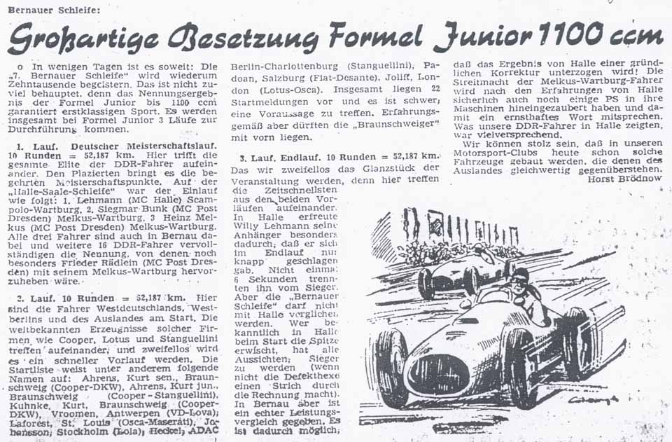 Als Ewald Laszig im Namen der Bezirksleitung Frankfurt (Oder) im ADMV um 10.00 Uhr die Sportler aus sieben Staaten auf der "Bernauer Schleife" begrüßte, waren äußerst ungünstige Witterungsverhältnisse zu verzeichnen. Im Laufe des Tages besserte sich aber das Wetter zusehends, so daß rund 55000 Zuschauer Zeuge von äußerst spannenden Rennen wurden, deren Höhepunkt zweifellos der Endlauf der Rennwagen Formel Junior war. Was bereits in der Vorschau angedeutet wurde, ist Wirklichkeit geworden. Das Ergebnis von Halle wurde einer starken Korrektur unterzogen und brachte den DDR-Fahrern die beiden ersten Plätze ein. Heinz Melkus (MC Post Dresden) mit seinem Melkus-Wartburg siegte vor Willy Lehmann (MC Halle), der mit seinem Scampolo-Wartburg knapp geschlagen wurde. Dieses Rennen wurde bei strömendem Regen gefahren und sah in dem Belgier Liekens auf Cooper-BMC den besten Ausländer in diesem Lauf. ... Abschließend kann festgestellt werden, daß die gesamte Organisation des Rennens durch den MC Bernau ausgezeichnet geklappt hat und daß sich vor allem auch alle Zuschauer äußerst diszipliniert benommen haben. VK Brödnow