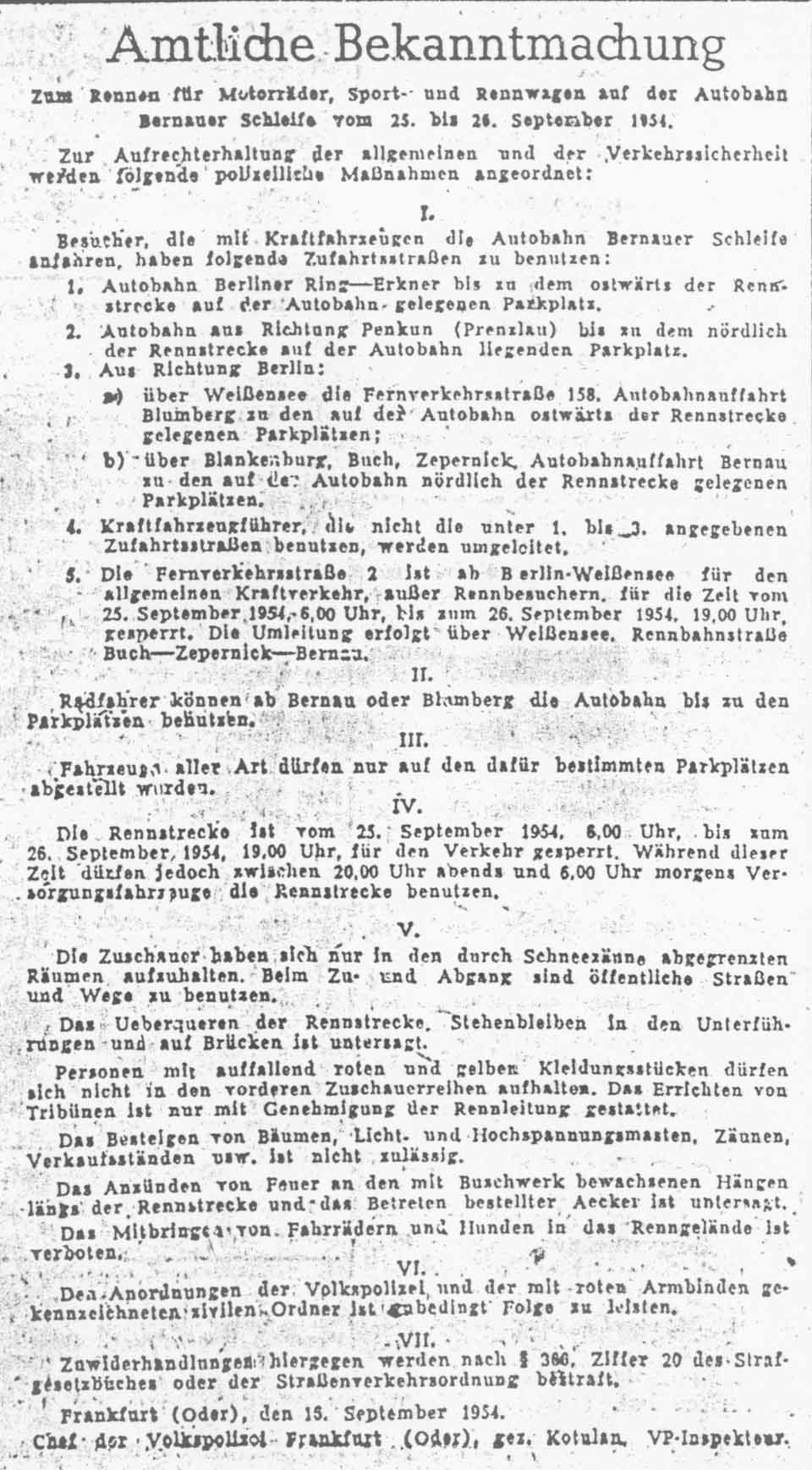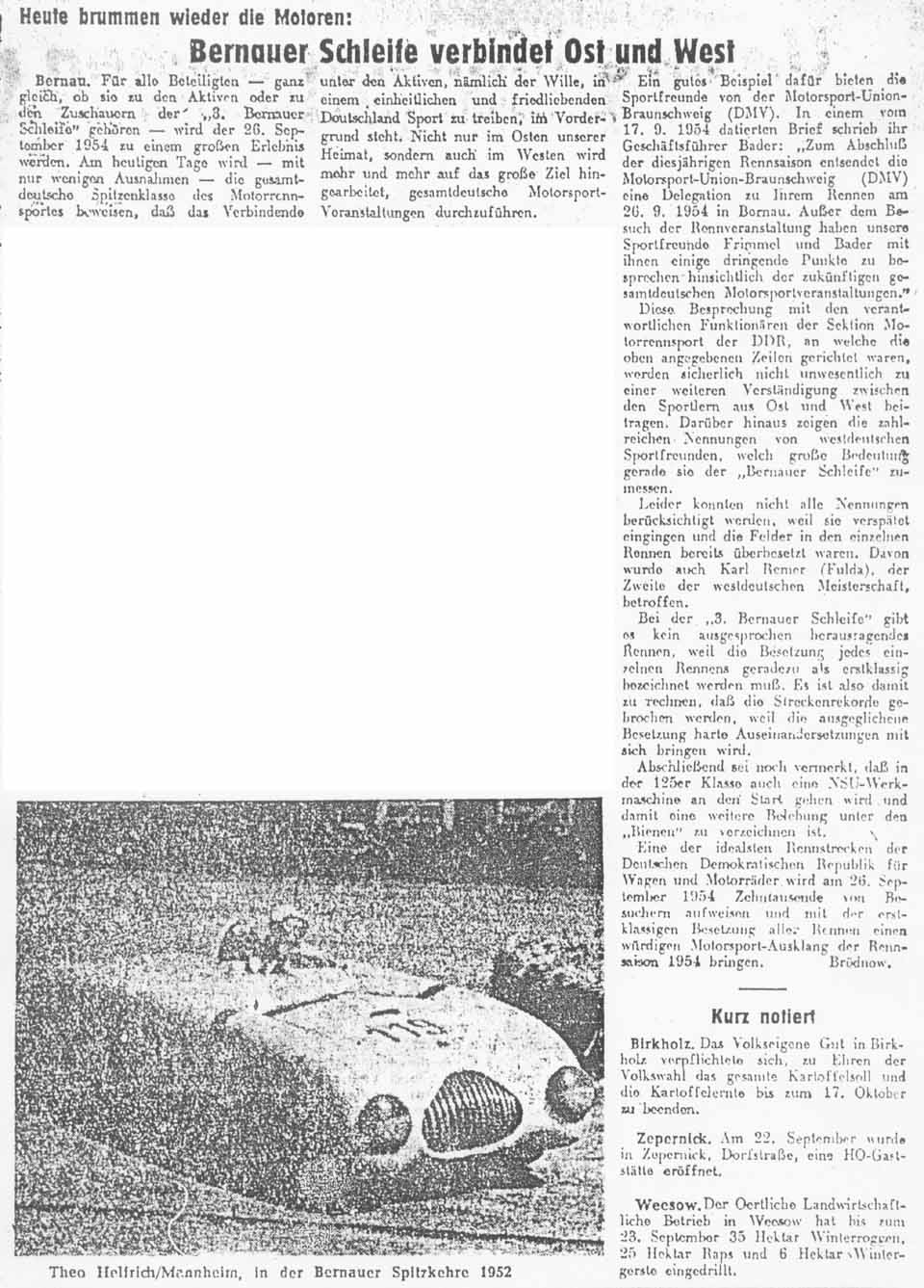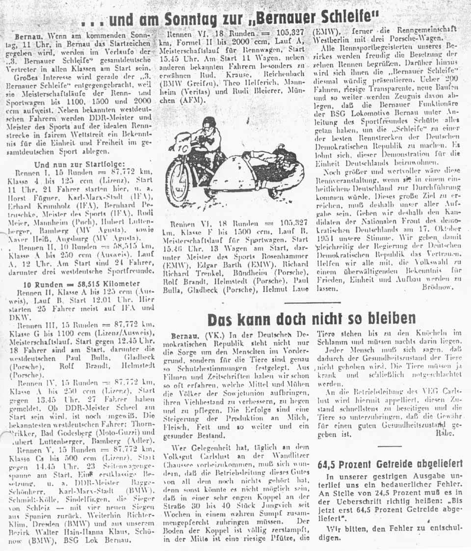 Meisterschaftslauf für Rennwagen, Start 15.45 Uhr. Am Start 11 Wagen, neben anderen bekannten Fahrern besonders zu erwähnen Rud. Krause, Reichenbach (BMW Greifzu), Theo Helferich, Mannheim (Veritas) und Rudi Bleierer, München (AFM) Rennen VI, 18 Runden = 105,327 km, Klasse F bis 1500 ccm, Lauf B, Meisterschaftslauf für Sportwagen, Start 15.46 Uhr. 13 Wagen am Start, darunter Meister des Sports Rosenhammer (EMW), Edgar Barth (EMW), Richard Trenkel, Bündheim (Porsche), Rolf Brandt, Helmstedt (Porsche), Paul Bulla, Gladbeck (Porsche), Helmut Laue (EMW), ferner die Renngemeinschaft Westberlin mit drei Porsche-Wagen ... Ueber 200 Fahnen, riesige Transparente und so weiter werden Zeugnis davon ablegen, daß die Bernauer Funktionäre der BSG Lokomotive Bernau unter Anleitung des Sportfreundes Schütte alles getan haben, um die "Schleife" zu einer der besten Rennstrecken der Deutschen Demokratischen Republik zu machen. ... |