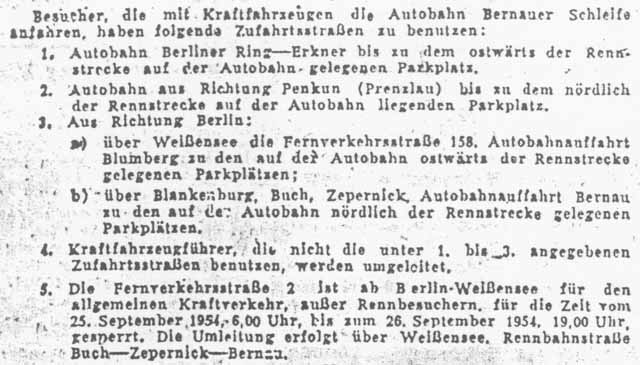 Besucher, die mit Kraftfahrzeugen die Autobahn Bernauer Schleife anfahren, haben folgende Zufahrtsstraßen zu benutzen: 1. Autobahn Berliner Ring - Erkner bis zu dem ostwärts der Rennstrecke auf der Autobahn gelegenen Parkplatz 2. Autobahn aus Richtung Penkun (Prenzlau) bis zu dem nördlich der Rennstrecke auf der Autobahn gelegenen Parkplatz. 3. Aus Richtung Berlin: a) über Weißensee, die Fernverkehrsstraße 158, Autobahnauffahrt Blumberg zu den auf der Autobahn gelegenen Parkplätzen, b) über Blankenburg, Buch, Zepernick, Autobahnauffahrt Bernau zu den auf der Autobahn nördlich der Rennstrecke gelegenen P... |