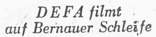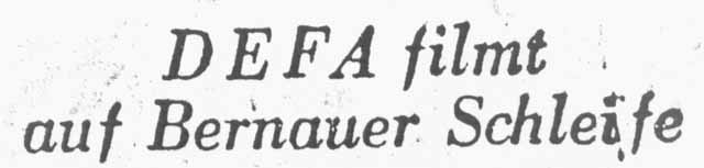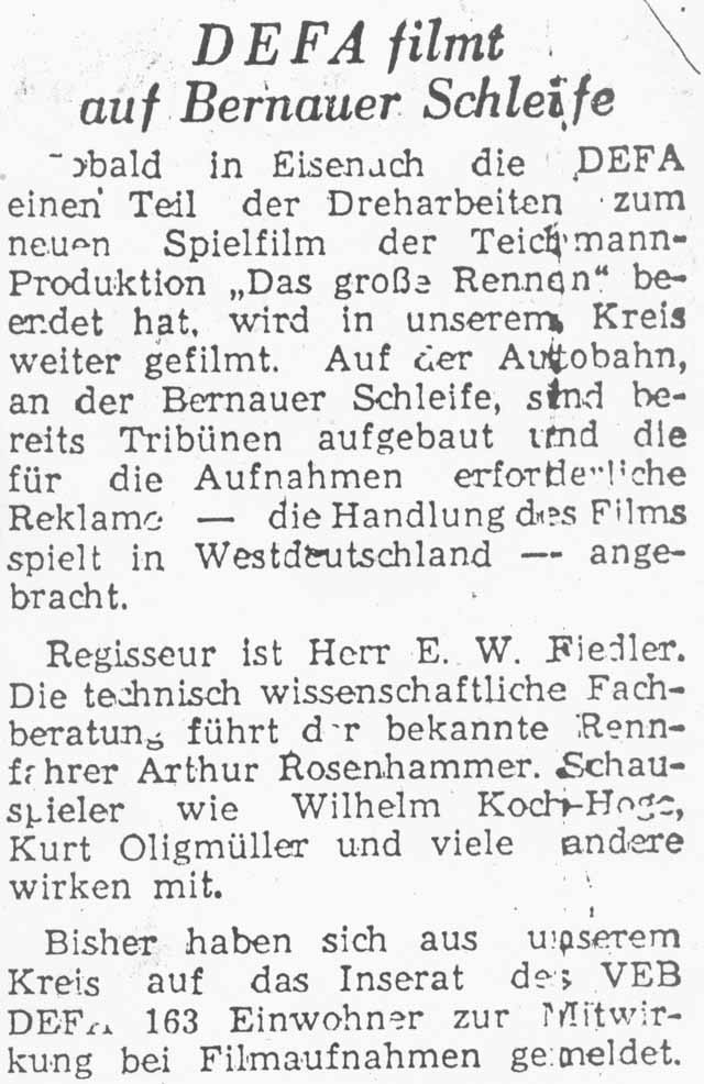 Auf der Autobahn, an der Bernauer Schleife, sind bereits Tribünen aufgebaut und die für die Aufnahmen erforderliche Reklame - die Handlung des Films spielt in Westdeutschland - angebracht. Regisseur ist Herr E. W. Fiedler. Die technisch wissenschaftliche Fachberatung führt der bekannte Rennfahrer Arthur Rosenhammer. Schauspieler wie Wilhelm Koch-Hoge, Kurt Olligmüller und viele andere wirken mit. Bisher haben sich aus unserem Kreis auf das Inserat des VEB DEFA 163 Einwohner zur Mitwirkung bei Filmaufnahmen gemeldet. |