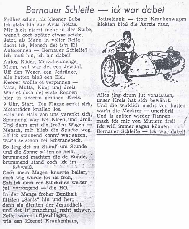Früher schon, als kleener Bube ick stets hin zur Avus hetzte. Mir hielt nischt mehr in der Stube, wenn't och später etwas setzte. Jetzt als Mann in voller Reife dacht ick, Mensch det is'n Ei! Autorennen - Bernauer Schleife? Ich muß hin, ich bin dabei! Autos, Räder, Menschenmenge, Mann, wat war det een Jewühl. Uff den Wegen een Jedränge, alle hatten bloß een Ziel. Keener wollte et verpennen - Vater, Mutter, Kind und Jreis. War et doch det erste Rennen hier in unserm schönen Kreis. 9 Uhr, Start. Die Flagge senkt sich, Motorräder knallen los. Hals um Hals von uns varenkt sich, Spannung war bei Kleen und Jroß. Und dann erst die jroßen Wagen - Mensch mir blieb die Spucke weg. Eh' ick staunend konnt' wat sagen, war'n se schon bei Schwanebeck. So jing det nu Stund' um Stunde und die Sonne schien so heiß, brummend machten die de Runde, brummend stand ooch ick im Schweiß. Ooch mein Magen knurrte heiter, doch wie wurde ick da froh. Sah ick doch een Stückchen weiter jut versorgend - die HO. |