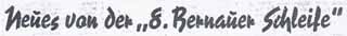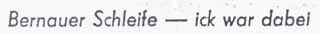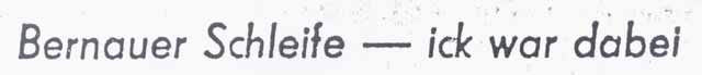 In der Menge froher Buntheit flitzten "Sanis" hin und her; den sie dienten der Jesundheit und det is' manchmal recht schwer. Zelte waren uffjeschlagen, wie een kleenet Krankenhaus, Jottseidank - trotz Krankenwagen kiekten bloß die Aerzte raus. ![]() Alles jing drum jut vonstatten, unser Kreis hat sich bewährt. Und die wirklich nischt von hatten, war'n die Meckrer - unerhört! Und is später wieder Rennen mach ick mir von Muttern frei! Ick will immer sagen können: Bernauer Schleife - ick war dabei! |