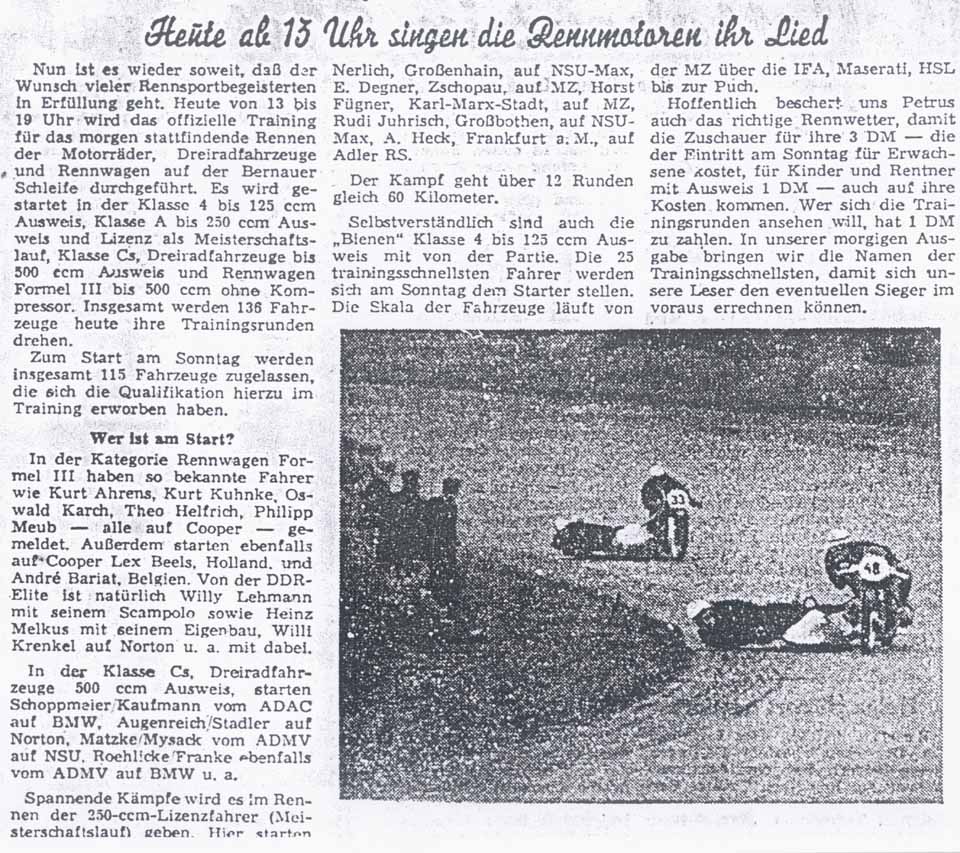 Am Sonntag dröhnen auf dem 5218-Meter-Kurs der Bernauer Schleife wieder die Rennmotoren. Diesmal sind es aber nicht in erster Linie die Motorräder, die dem Tag das Gepräge geben, noch packender dürften die Wettbewerbe der Formel-Junior-Rennwagen werden. Die kleinen Flitzer mit ihren 1100 ccm werden sich in drei Läufen spannende Kämpfe liefern. Unsere DDR-Fahrer mit ihren verschiedenen "Wartburg"-Versionen beginnen den Meisterschaftslauf. Die Dresdener Melkus, Bunk und Rädlein müßten die Erfahrungen von der Halle-Saale-Schleife so genutzt haben, daß sie diesmal auch gegen die westdeutschen und ausländischen Teilnehmer eine Chance haben. Bei den Gästen sind Ahrens senior und junior neben Kuhnke (alle Braunschweig) die aussichtsreichsten Bewerber. Allerdings starten in ihrem Lauf Konkurrenten aus Schweden, Frankreich, England, Holland, Oesterreich und der Schweiz, die nicht zu unterschätzen sind. Der Höhepunkt wird dann das Aufeinandertreffen der 20 zeitschnellsten Fahrer beider Läufe sein. ... |