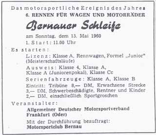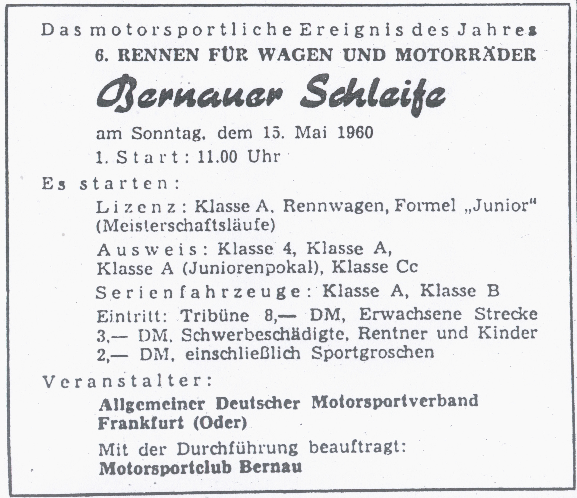 Bernauer Schleife am Sonntag, dem 15. Mai 1960 1. Start: 11.00 Uhr Es starten: Lizenz: Klasse A, Rennwagen, Formel "Junior" (Meisterschaftsläufe) Ausweis: Klasse 4, Klasse A, Klasse A (Juniorenpokal), Klasse Cc Serienfahrzeuge: Klasse A, Klasse B Eintritt: Tribüne: 8,- DM, Erwachsene Strecke 3,- DM, Schwerbeschädigte, Rentner und Kinder 2,- DM, einschließlich Sportgroschen |
