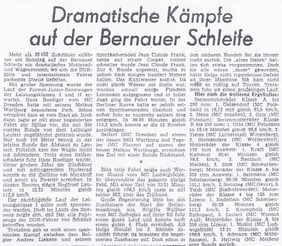 Dramatische Kämpfe auf der Bernauer Schleife Mehr als 35000 Zuschauer erlebten am Sonntag auf der Bernauer Schleife ein dramatisches Motorrad- und Wagenrennen, wo sich die DDR-Elite und internationale Fahrer packende Duelle lieferten. Mit großer Spannung wurde der Lauf der Formel-Junior-Rennwagen der Leistungsklassen I und II erwartet. Hans Roediger vom MC Dresden hatte mit seinem Melkus Wartburg besonderes Pech. Schon verspätet kam er vom Start ab. Doch dann jagte er mit einer begeisterten Fahrt zur Spitze vor, die seit der vierten Runde von dem Leipziger Leutert ungefährdet gehalten wurde. Nur noch hundert Meter betrug in der letzten Runde der Abstand zu Leutert. Plötzlich kam der Wagen leicht ins Schleudern. Trotz eines Reifenschadens fuhr Hans Roediger weiter. Unter großem Jubel der Zuschauer und mit schlingerndem Hinterrad konnte er die Ziellinie vor Markhoff und somit als zweiter erreichen. In diesem Rennen siegte Siegfried Leutert in 32,22 Minuten gleich 112,8 km/h. Der nachfolgende Lauf der Leistungsklasse I sollte noch spannender werden. Doch im Laufe des Rennens zeigte sich, daß fast alle Fahrzeuge der DDR-Fahrer von Schäden betroffen wurden. Trotzdem gab es noch einen spannenden Kampf zwischen dem Belgier Andree Liekens und seinem Sportkameraden Jean Claude Frank, beide auf einem Cooper. Immer schneller wurde Jean Claude Frank. Zur 6. Runde angesetzt, mußte er jedoch nach einigen hundert Metern halten. Das Kühlwasser kochte. Da nicht gleich Wasser zur Stelle war, wurden schnell einige Flaschen Limonade aufgegossen und in toller Jagd ging die Fahrt weiter. In der Berliner Kurve hatte er jedoch seinen Sportkameraden überholt und sicher fuhr er nunmehr seinem Sieg entgegen. In 39,38 Minuten gleich 115,2 km/h konnte er die 15 Runden zurücklegen. ... |