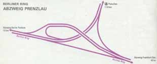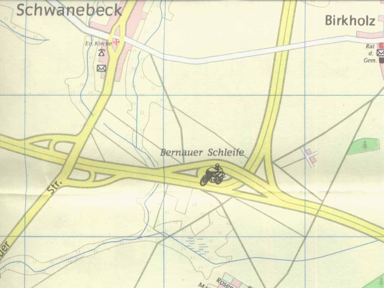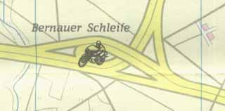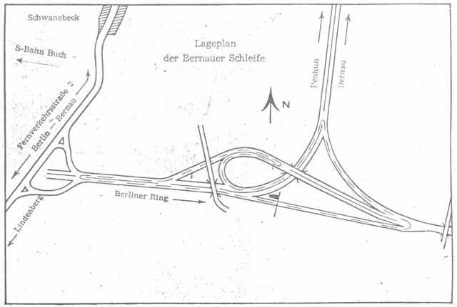 Der Verlauf der Rennstrecke innerhalb der Bernauer Schleife, gefunden im Stadtarchiv Bernau in einem Prospekt der "11. Bernauer Schleife" von 1965. Anm.: Anfangs umfasste die Stecke am westlichen Ende noch die Autobahnauf- und -abfahrt "Weißensee" und war dadurch noch ein Stück länger (5,8 statt 5,2 Kilometer). |