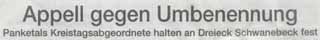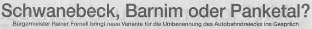 Das Amt Panketal, dem die Gemeinde Schwanebeck angehört, witterte allerdings, dass das weltberühmte Schwanebeck möglicherweise künftig als Namensgeber verschmäht werden würde und hatte vorsorglich schon mal angemeldet, dass in diesem Fall das Dreieck doch "Dreieck Panketal" heißen sollte. |