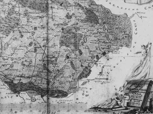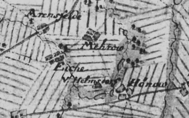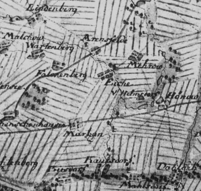 | Die damalige Wegesituation erklärt aber sehr gut die eigenwillige Straßenführung am nördlichen Dorfausgang heute. Die Dorfstraße zeigt, nachdem sie die Kirche im Bogen umrundet hat, direkt nach Eiche. (Der Weg dorthin ist jetzt noch etwa im Bauzustand von 1776...) Heute macht die Straße jedoch hinter den letzten Mehrower Häusern einen 90-Grad-Knick und führt dann geradeaus nach Nordosten über Hoheneiche nach Ahrensfelde. Seit wann diese Straßenführung existiert, werden wir auch noch herausbekommen. Nachzuforschen ist auch noch, was es mit dem "V. Helmsdorf" zwischen Eiche und Hönow auf sich hat - vermutlich ein Vorwerk, das heute nicht mehr existiert. |