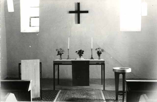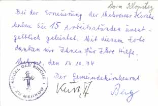 | Ein Foto vom Herbst 1974 zeigt die renovierte Kirche - damals ganz modern. Heute trauert mancher der vermutlich kitschigen, aber wenigstens historischen alten Einrichtung nach ... Die dringend erforderlichen Reparaturen, die Renovierung und die Neueinrichtung der Kirche waren nur durch die Mithilfe vieler Gemeindeglieder zu schaffen - darunter Dorothea Klopsteg, bei der sich Pfarrer Kurz und Herr Berg als Vertreter des Gemeindekirchenrates mit ein paar Worten auf der Rückseite des Bildes bedanken. |