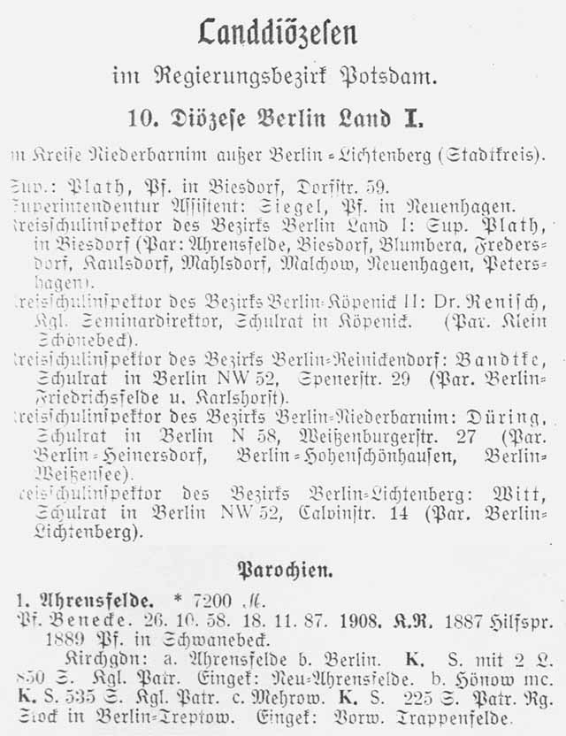 Eine wichtige Quelle für die Beurteilung der Größe, Situation und Zugehörigkeit eines Ortes stellten schon immer die Aufzeichnungen der Kirchengemeinden dar. Im Zentrum für Berlin-Studien im Ribbeck-Haus in der Breite Straße in Berlin-Mitte haben wir verschiedene Jahrgänge des vom Evangelischen Konsistorium der Mark Brandenburg herausgegebenen Pfarralmanach für Berlin und die Provinz Brandenburg Hier sei als Beispiel nur ein Auszug aus dem Pfarralmanach von 1913 gezeigt. Die Auszüge der anderen genannten Jahrgänge finden sich als Faksimile unter "Quellen / Pfarralmanach". Wir wollen es künftig so halten, daß umfangreiche Quellen, egal ob Texte, Tabellen oder Bilder, separat abgelegt werden, um Besucher ohne einen schnellen Internetanschluß nicht mit extrem langen Ladezeiten zu ärgern und solche, die nicht so sehr an geschichtlichen Details interessiert sind, nicht übermäßig zu nerven. |