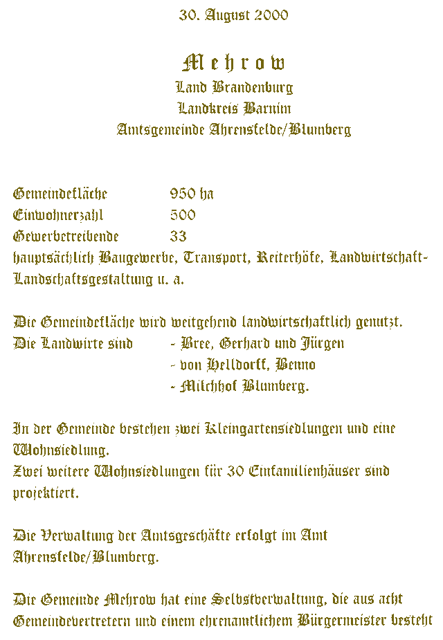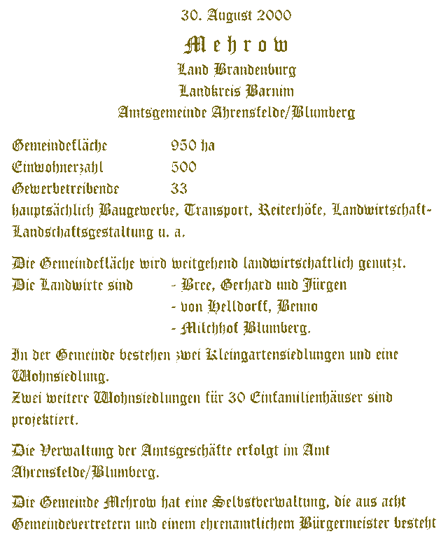 Am 30.August 2000 wurde beim Richtfest für die restaurierte Dorfkirche eine Kugel auf die Kirchturmspitze gesetzt, in die Pfarrer Müller eine eine sogenannte "Zeitkapsel" gesteckt hat. Diese enthält die Rekonstruktionsbeschreibung, eine Liste der an der Restauration beteiligten Baufirmen, einige derzeit gültige Münzen, Abschriften der Dokumente über den Kirchenbrand (1785) und die Glockenbeschaffung (1828) sowie folgendes Dokument mit Angaben zum Ort:. |
