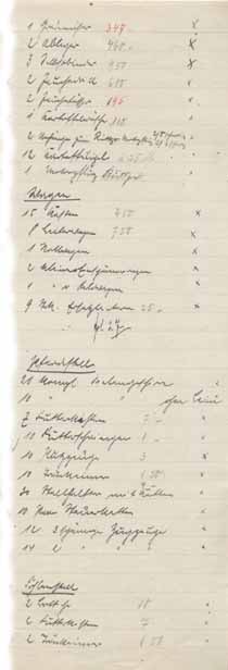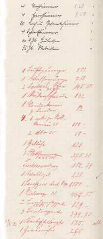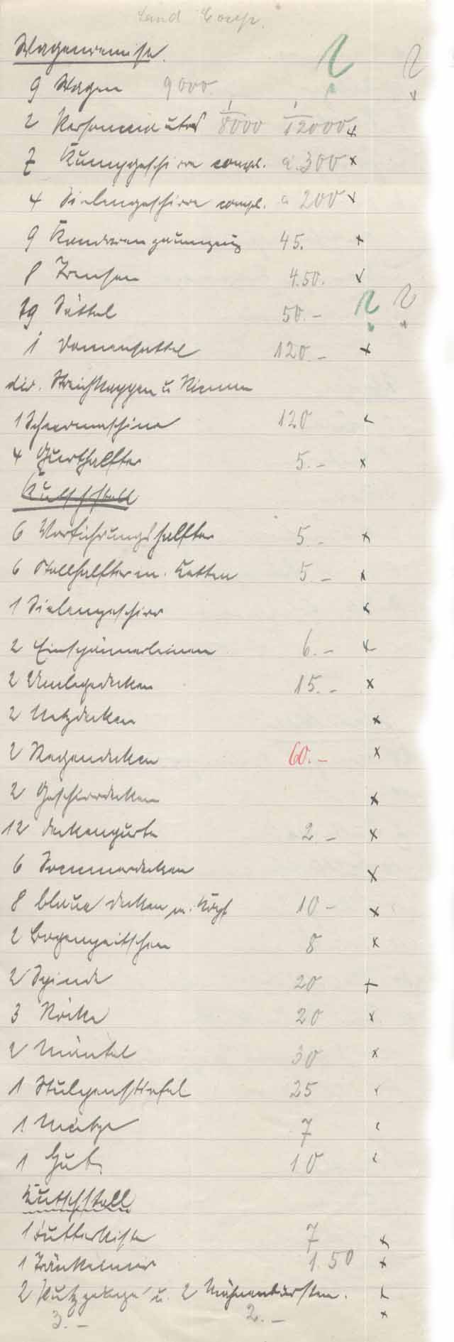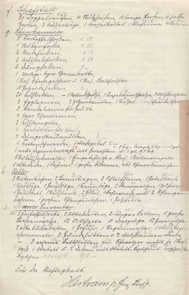 | f) Schafstall 21 Doppelraufen (1,50), 11 Stützhorden ?, 15 lange Horden, 6 halbe Horden, 3 Wassertröge (2.-), 1 Wasserkübel (1,-), 1 Blecheimer (1,50), 4 Laternen (1,-) g) Schirrkammer 5 Kartoffelforken (1,50), 1 Rübenforke (1,50), 2 Raduhacken (1,50), 3 Aufstakforken (1,50), 2 Dunghaken (1,-), 1 Vorlege- bezw. Spannkette, 1 Rel. Pferdegeschirr u. 1 Rel. Stallhalfter, 15 Getreidehacken (2,-), 20 Kuhketten ?, 1 Wundspritze (7,-), 1 Injektionsspritze (7,-), 2 Milchkatheter, 3 Eggleinen, 2 Zitzenkanülen, 1 Raspel (1,-), 1 Aufschneideschere (3,-), 5 Bindeleinen für Heu etc., 4 Paar Scherriemen, 3 Kuhstringeln, 4 Kardätschen für Pferde, 4 Düngerstreumulden (3,-), 1 Kettenschneider, 1 Maßzirkel (5,-), 1 neue Dezimalwaage mit Gewichten (58.-) 5 kg, drei zu 2 kg eins zu 1 kg u. 1 zu 0,5 kg, 8 Rübenhackmesser (2,-), 1 Eingabeflasche a. Blech, 1 Pilleneingeber, 1 alte Decke, 1 Fahrrad, 1 große Ölkanne, 4 kl. Schmierkännchen |
