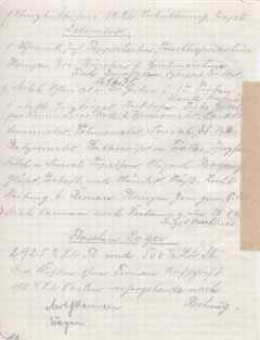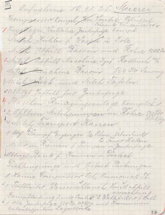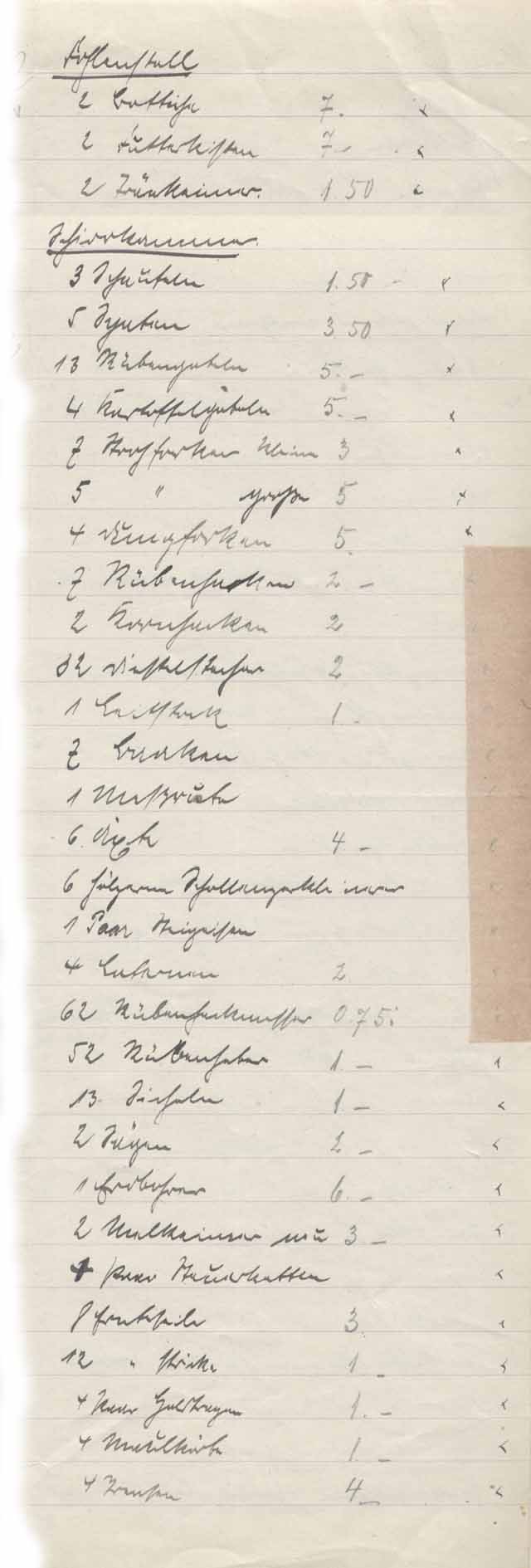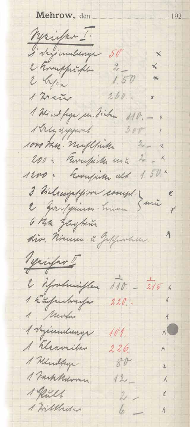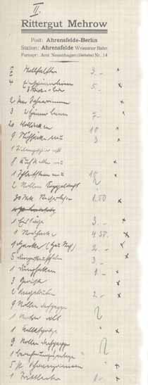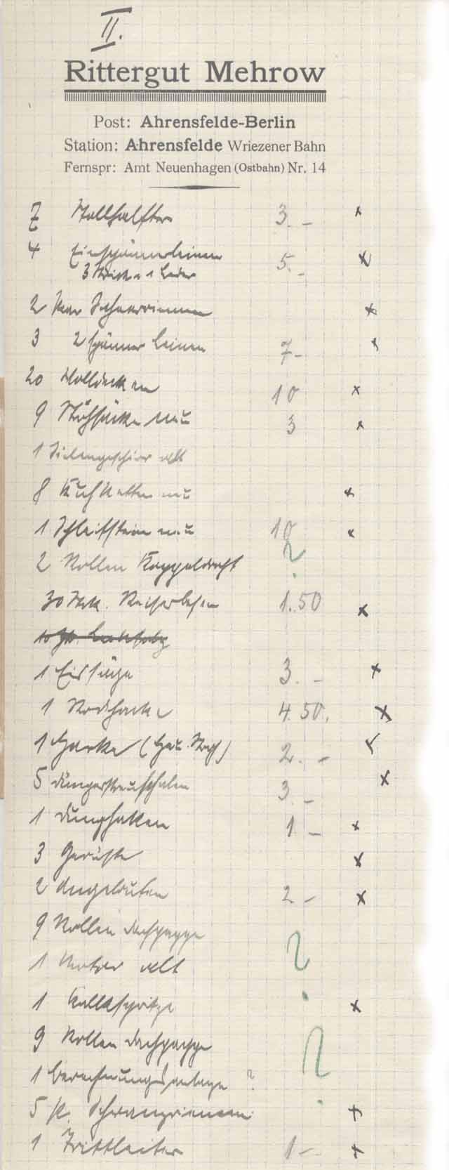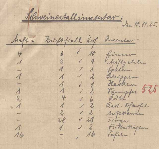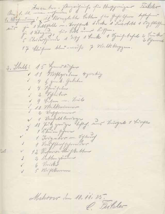 | Inventarverzeichnis für Oberspringer Fickler Am 1.11. waren vorhanden: 1. Wohnung: 11 komplette Betten für Gehilfen bestehend aus je 1 Bettstelle m. Strohsack, 1 Decke, 1 Federbett, 1 Kopfkissen, je 1 Überzug für Bett und Kissen, 5 Kleiderspinde, 1 Tisch, 1 Bank, 1 Speisetafel, 2 Bänke, 17 Blusen blau-weiß, 7 Melkkappen 2. Stall: 15 Handtücher; 11 Mistgraben, 4zinkig; 4 6zink. Gabeln; 4 Schaufeln; 2 Schieber (?), 10 Melkeimer; 2 Wascheimer; 1 Vorfallbandage (?), 10 Putzzeuge best. aus Striegel & Bürste; 1 Irrigator m. Schlauch; 1 ...strohschneider; 12 Reform Kuhketten; 2 Kettenzäume; 6 Stricke; 5 Mistkarren Mehrow, den 10.11.25 ... Fickler |