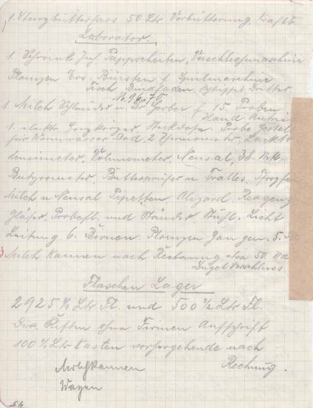 d) Kuhstall 5 Dungkarren (15,-), 5 Dungforken (1,50), 5 Blechschaufeln (2,50), 1 Schlundrohr (82,-), 1 Bullenzange (15,-), 1 Irrigator mit Schlauch (9,-), 10 Rel. Kuhketten, 82 Ketten aus Hanf, 2 Bänke (1,-), 6 Tränkeimer von Blech (1,50), 2 Milchsiebe (4,-), 5 Melkeimer (5,-), 1 Maßkanne (15,-), 6 Laternen (1,-) e) Pferdestall 1 Schaufel (1,50), 2 Laternen (1,-), 18 Stallhalftern mit Ketten, 18 kompl. Pferdegeschirre, 6 Pferde-Putzzeuge (1,-), 4 Futterschwingen ? (2 fehlen u. sind schon vor Monaten bestellt) (1.-), 5 Tränkeimer (3 hölzerne und 2 Blecheimer) (1,50), 1 Arzneischrank (Inhalt) (10,-) |